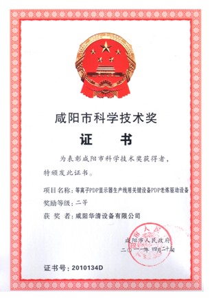 咸陽華清設(shè)備科技有限公司“等離子PDP顯示器生產(chǎn)線用關(guān)鍵設(shè)備PDP老煉驅(qū)動設(shè)備”獲得2010年度咸陽市科學(xué)技術(shù)獎